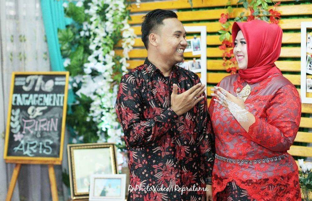 7. Untuk prosesi tunangan, pilih kebaya dari kain brokat warna merah yang dipadukan dengan hijab segiempat serta rok batik bermotif bunga
