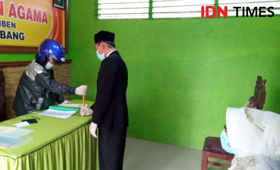Jombang, IDN Times - Penghulu di setiap KUA (kantor urusan agama) di Kabupaten Jombang masih tetap melayani prosesi akad nikah calon pengantin yang sudah terdaftar. Akan tetapi, penghulu yang menikahkan memakai helm dan jas hujan. Pakaian itu diharapkan bisa mencegah penularan COVID-19.