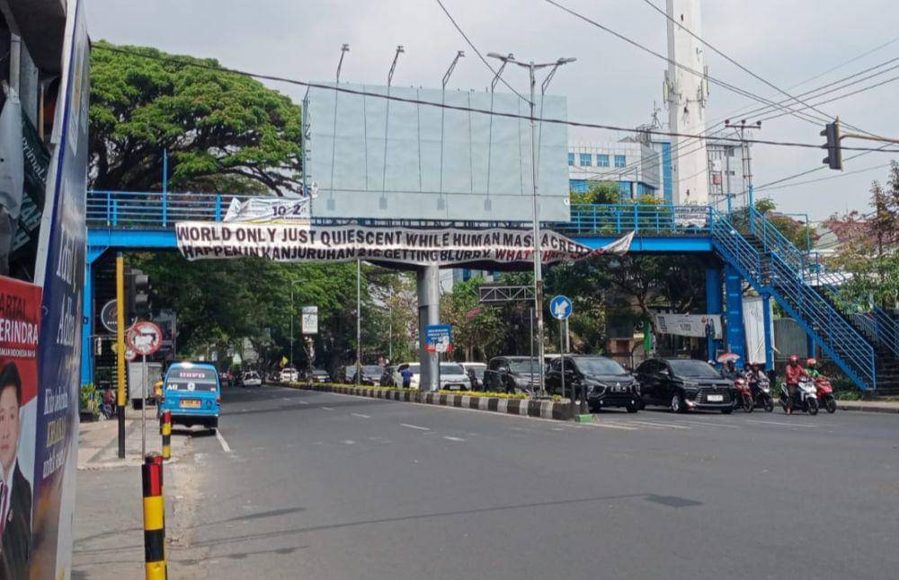 Spanduk yang membentang panjang tersebut berwarna putih dengan tulisan berwarna hitam. Tertulis dalam bahasa inggris 'World Only Just Quiescent While Human Massacred, Happen In Kanjuruhan 2 Is Getting Blurry, Whats Happen?' Kalau diartikan kurang lebih adalah 'Dunia Hanya Sepi saat Manusia Dibantai, Yang Terjadi di Kanjuruhan pada Abad 21 Semakin Buram. Apa yang Terjadi?